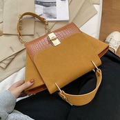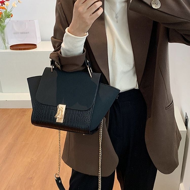 上品なヌバック調合皮とフェイクレザーを組み合わせたリュスクなデザインのミニショルダーバッグ。内ポケットがあり、荷物を整理整頓することができ、マチもあるので、収納力もしっかりとあります。
