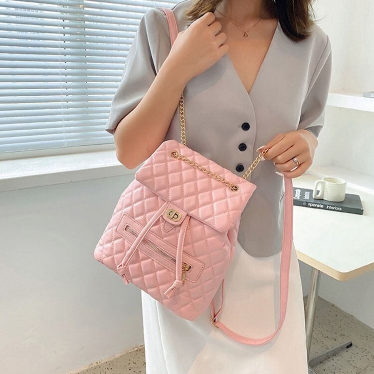 エレガントで女性らしいフェミニンな印象のキルティング仕様、チェーンショルダーを加えてカジュアルおしゃれなオトナ女子リュック。
